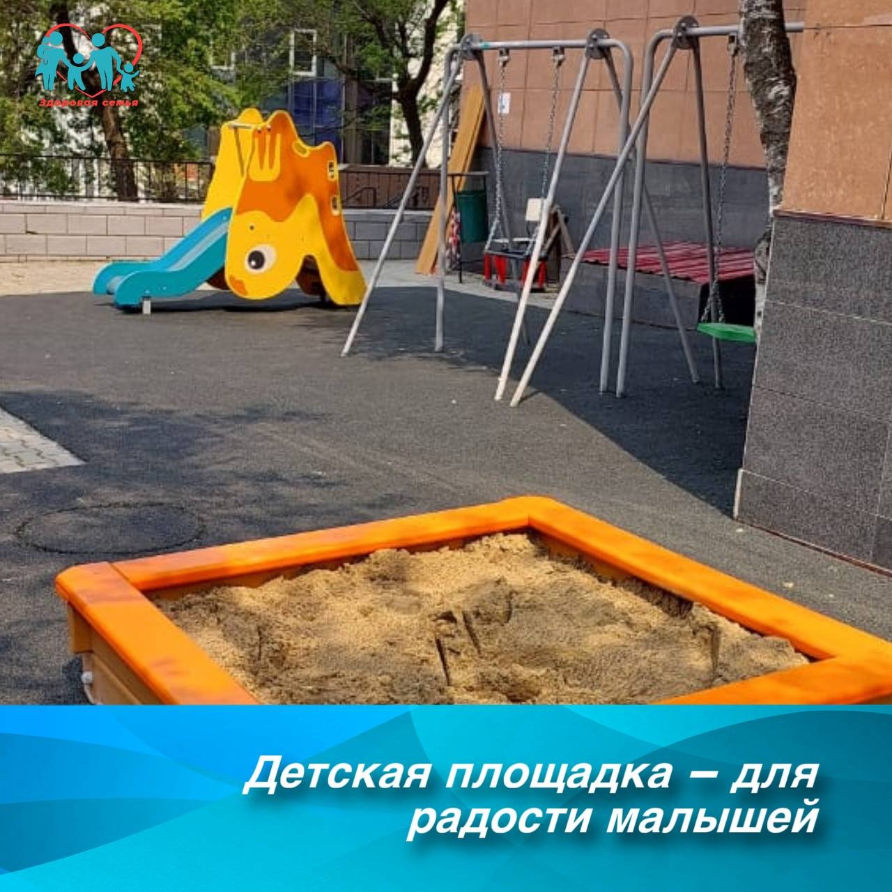 Яркая детская игровая площадка с качелями, песочницей, лавочками и мини-горкой появилась на территории Краевого ...
